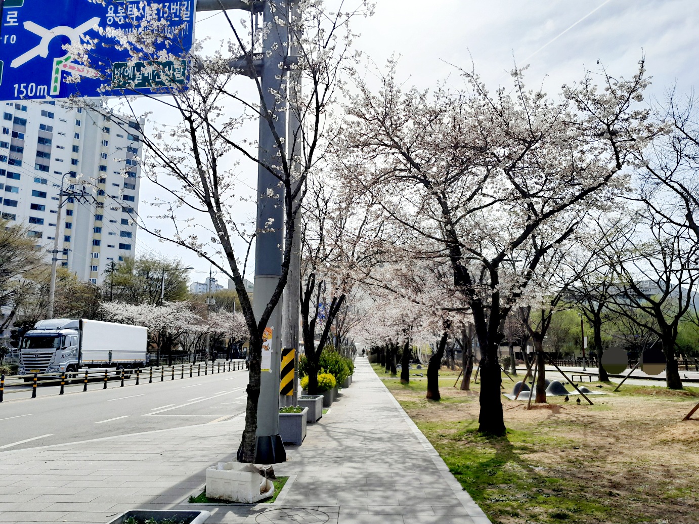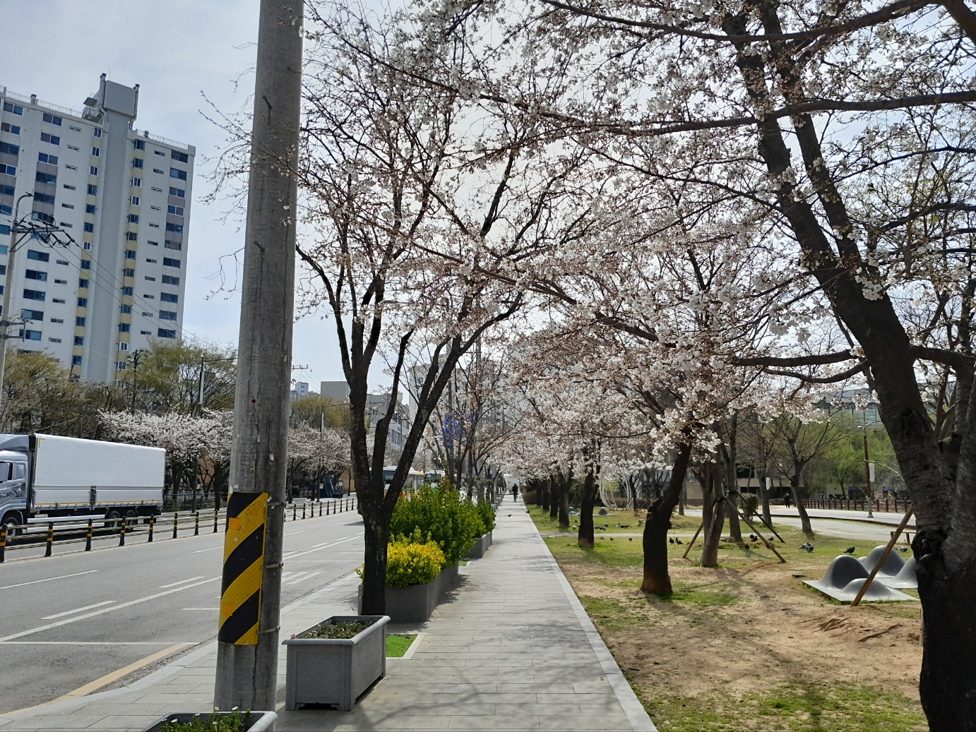 어린이 놀이터 옆에 있는 벚꽃은 다 피려면 멀었어요. 20%도 안 핀 느낌이에요. 비엔날레 호수공원에는 벚꽃이 많이 피었어요.