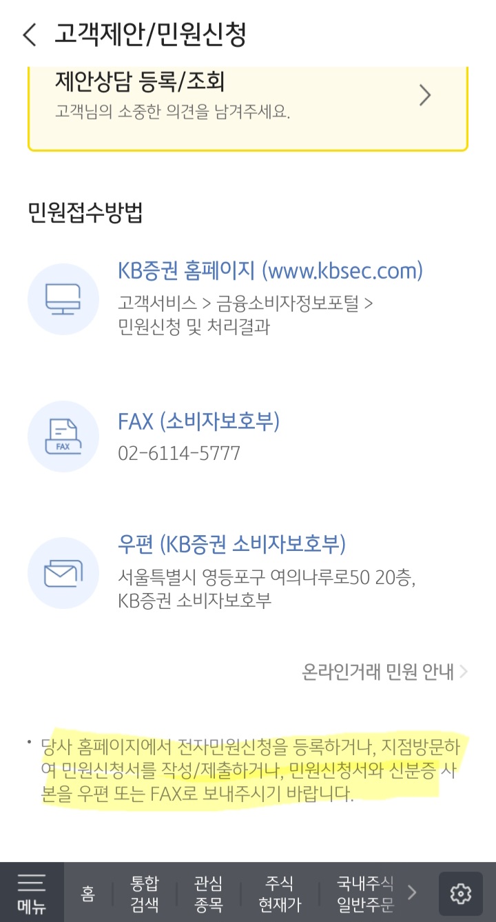 민원신청이 어플에서는 안 되는 듯해서 컴퓨터 켜서 신청했습니다. 오전 8시에 바로 매도하려 했는데 입고가 안되어 있더라고요. 매도했을 때는 이미 주가는 떨어진 상황이라 민원신청 해봤습니다. 컴퓨터에는 공인인증서 저장을 안 해놔서 계좌아이디, 아이디비번(잊어버려서 재설정함), 공인인증서 비번 입력한 후 민원신청 했어요.