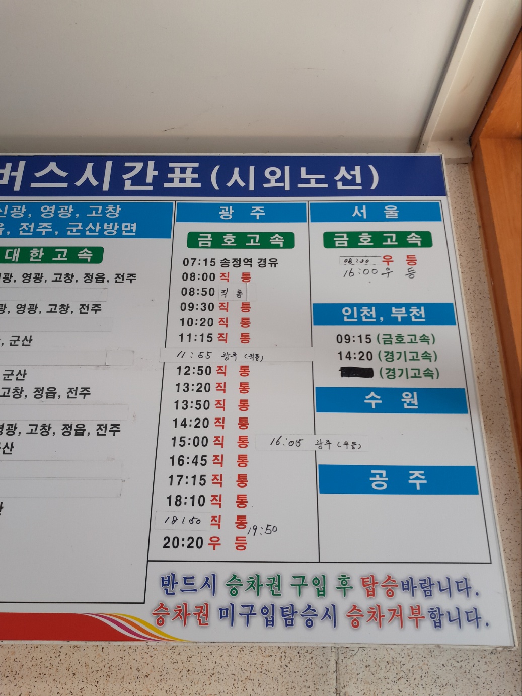 함평공영터미널에서 광주 유스퀘어 터미널 가는 버스 시간표입니다. 아침 7시 15분부터 저녁 8시 20분까지 버스가 있네요. 티머니고 어플에도 안 뜨고 함평터미널에 있는 키오스크에도 버스 시간이 다 안 뜨길래 직접 매표소에서 표 끊었어요. 지정좌석이 아니네요. 선착순대로 앉으면 되고, 표는 버스 내릴 때 기사님에게 주면 됩니다.