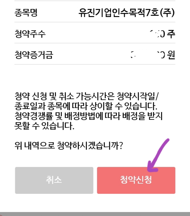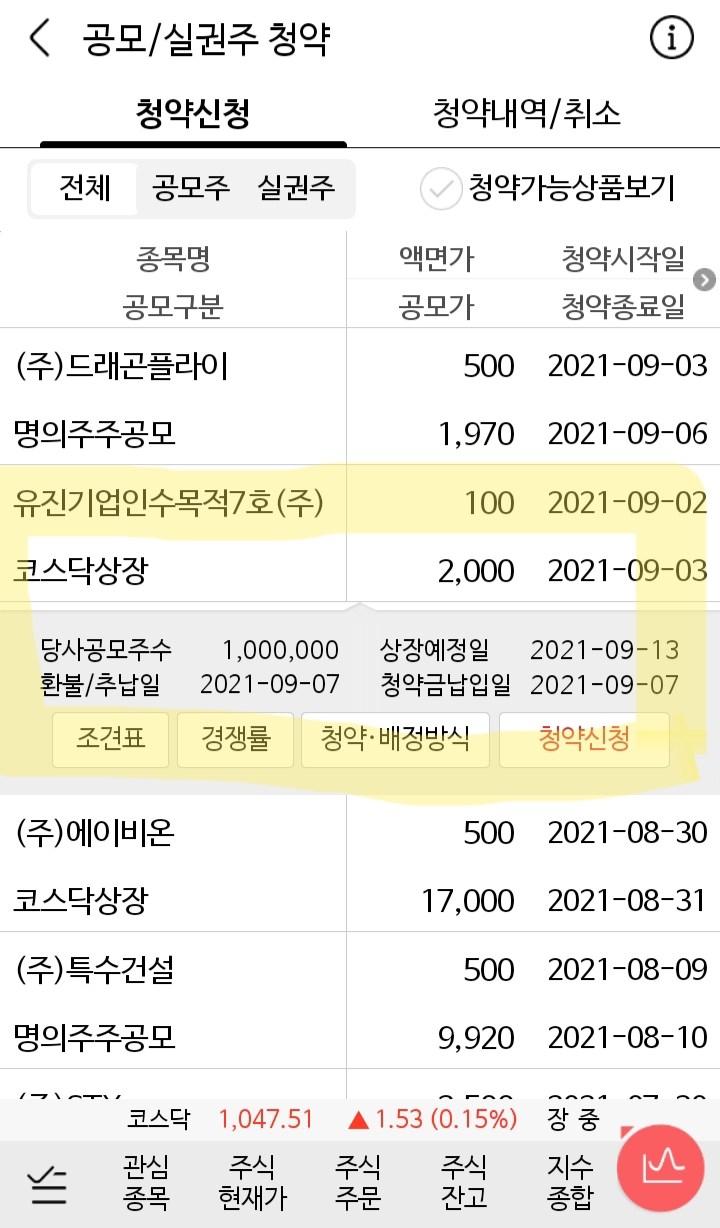 4) 유진기업인수목적7호 (주) 클릭해서 빨간글자 청약신청을 누르면 됩니다.