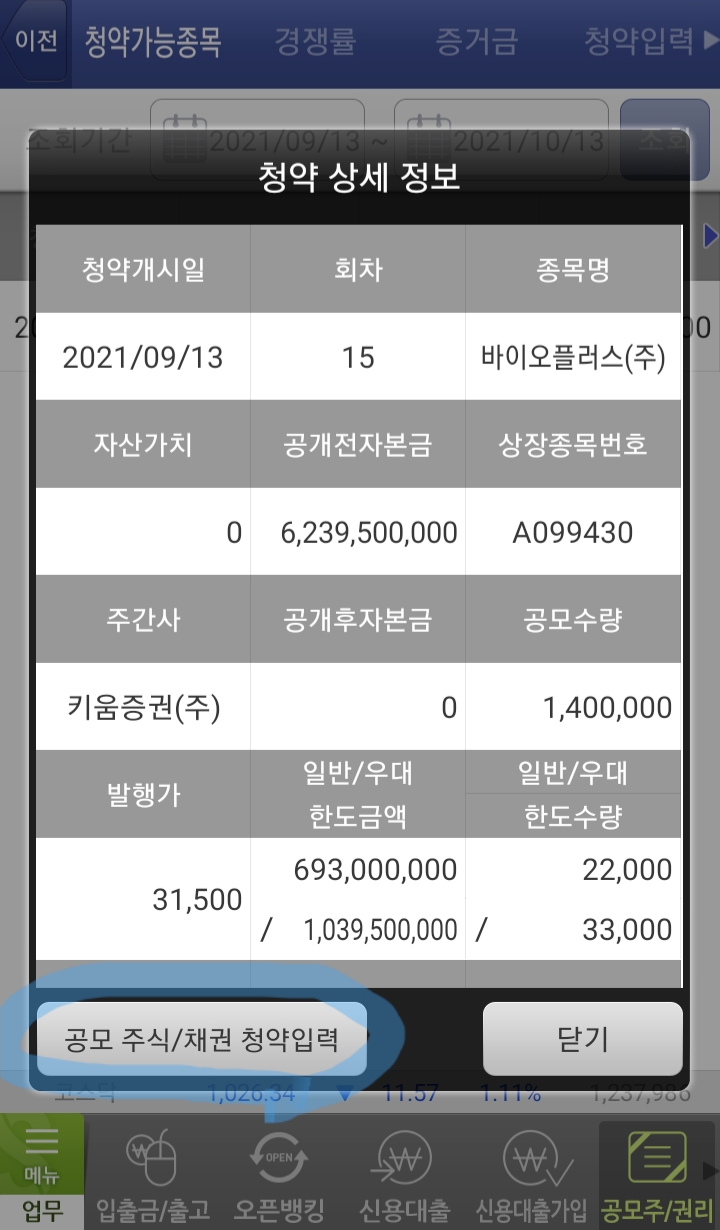 키움증권 영웅문S 앱에서 청약 신청했어요.