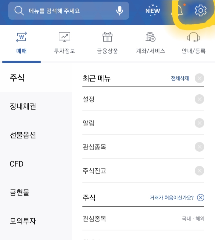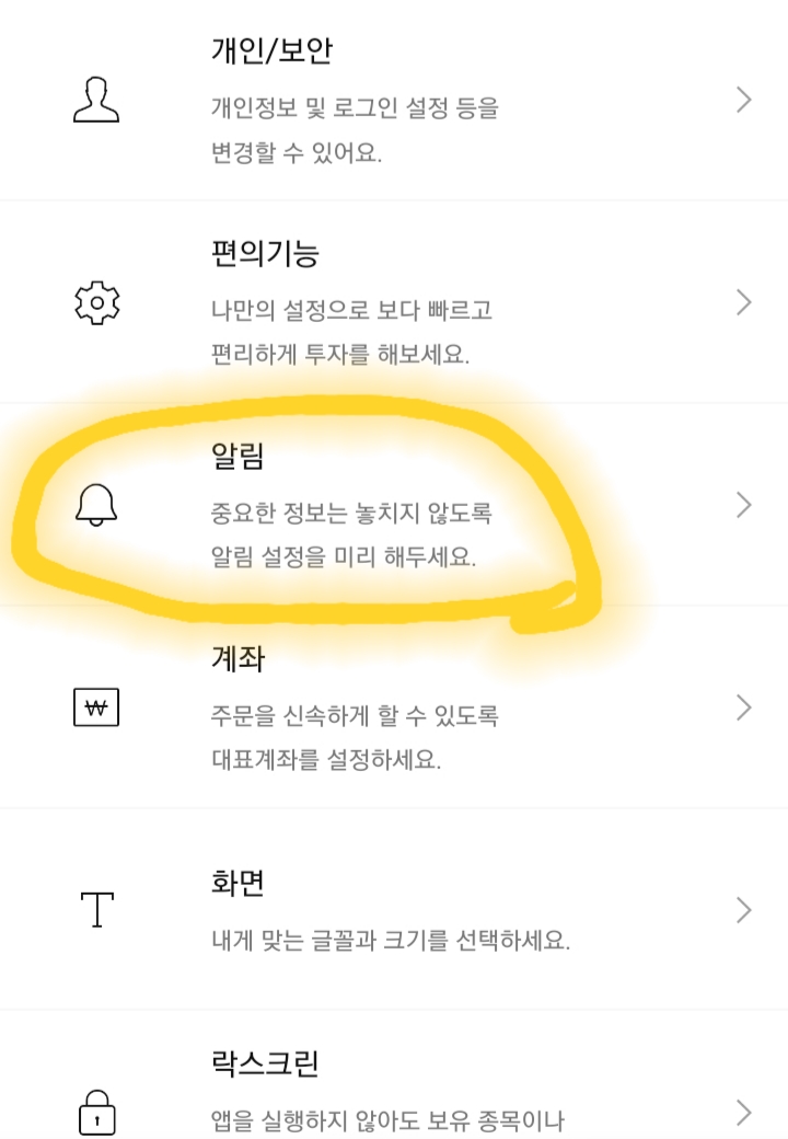 한국투자증권 앱 이리저리 찾아보다가 알림 설정 방법 찾았어요.